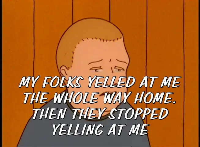 MY FOLKS YELLED AT ME THE WHOLE WAY HOME. THEN THEY STOPPED YELLING AT ME
