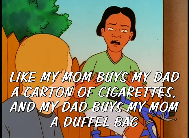 LIKE MY MOM BUYS MY DAD A CARTON OF CIGARETTES, AND MY DAD BUYS MY MOM A DUFFEL BAG