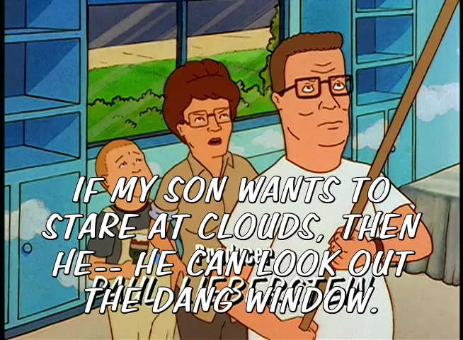 IF MY SON WANTS TO STARE AT CLOUDS, THEN HE-- HE CAN LOOK OUT THE DANG WINDOW.