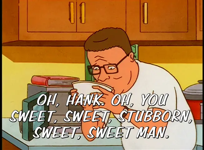 OH, HANK. OH, YOU SWEET, SWEET, STUBBORN, SWEET, SWEET MAN.