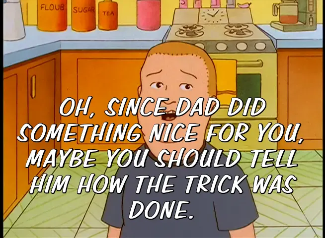 OH, SINCE DAD DID SOMETHING NICE FOR YOU, MAYBE YOU SHOULD TELL HIM HOW THE TRICK WAS DONE.