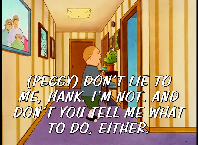 (PEGGY) DON'T LIE TO ME, HANK. I'M NOT. AND DON'T YOU TELL ME WHAT TO DO, EITHER.