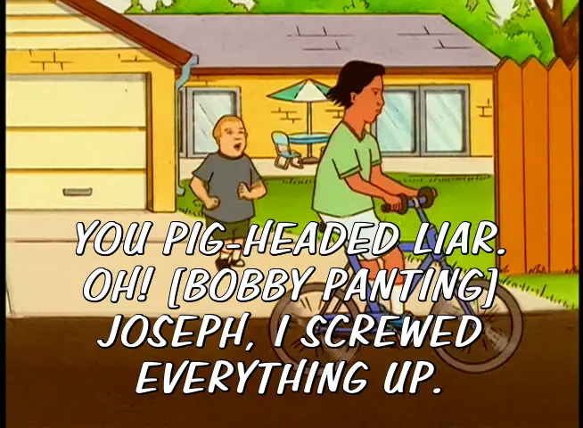 YOU PIG-HEADED LIAR. OH! [BOBBY PANTING] JOSEPH, I SCREWED EVERYTHING UP.