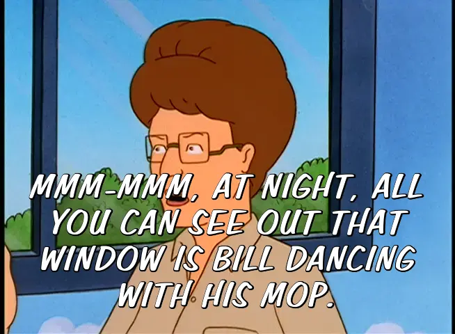 MMM-MMM, AT NIGHT, ALL YOU CAN SEE OUT THAT WINDOW IS BILL DANCING WITH HIS MOP.