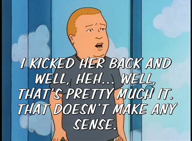 I KICKED HER BACK AND WELL, HEH... WELL, THAT'S PRETTY MUCH IT. THAT DOESN'T MAKE ANY SENSE.