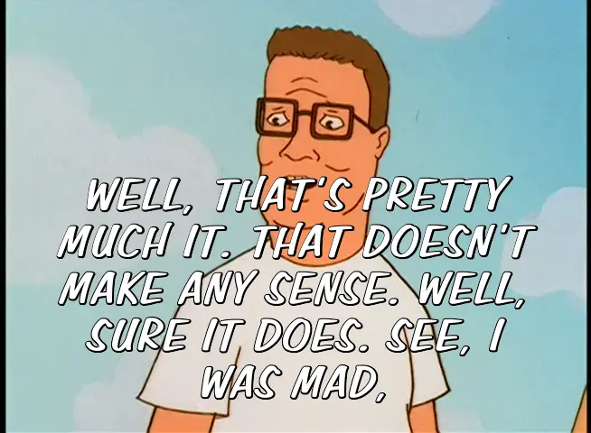 WELL, THAT'S PRETTY MUCH IT. THAT DOESN'T MAKE ANY SENSE. WELL, SURE IT DOES. SEE, I WAS MAD,