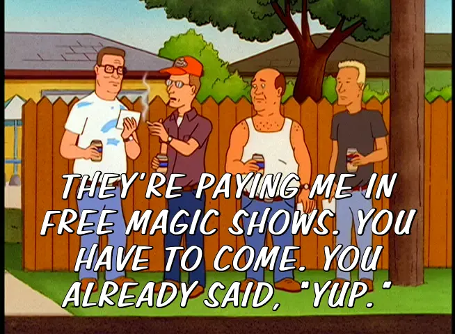 THEY'RE PAYING ME IN FREE MAGIC SHOWS. YOU HAVE TO COME. YOU ALREADY SAID, "YUP."