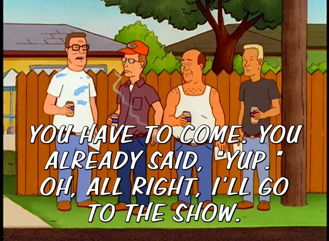 YOU HAVE TO COME. YOU ALREADY SAID, "YUP." OH, ALL RIGHT, I'LL GO TO THE SHOW.