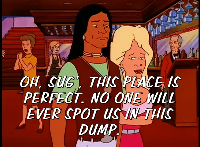 OH, SUG', THIS PLACE IS PERFECT. NO ONE WILL EVER SPOT US IN THIS DUMP.