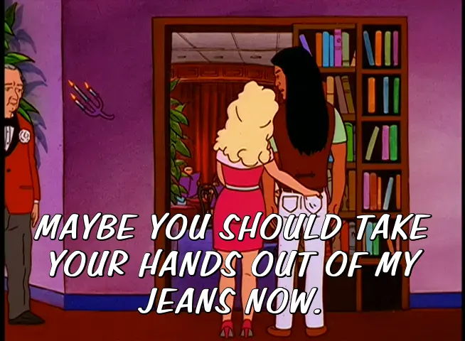MAYBE YOU SHOULD TAKE YOUR HANDS OUT OF MY JEANS NOW.