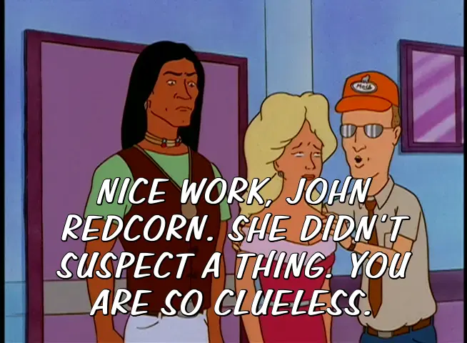 NICE WORK, JOHN REDCORN. SHE DIDN'T SUSPECT A THING. YOU ARE SO CLUELESS.
