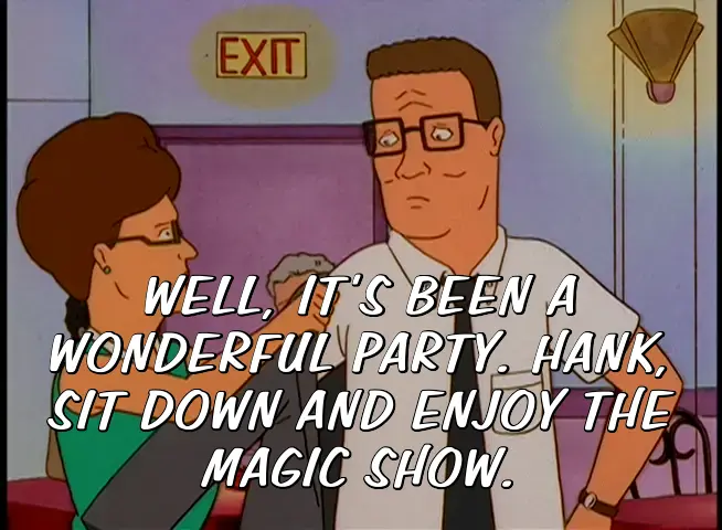 WELL, IT'S BEEN A WONDERFUL PARTY. HANK, SIT DOWN AND ENJOY THE MAGIC SHOW.