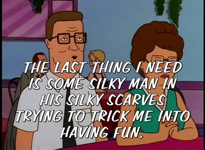 THE LAST THING I NEED IS SOME SILKY MAN IN HIS SILKY SCARVES TRYING TO TRICK ME INTO HAVING FUN.