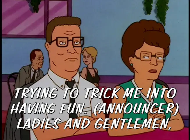 TRYING TO TRICK ME INTO HAVING FUN. (ANNOUNCER) LADIES AND GENTLEMEN,