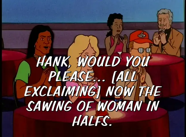 HANK, WOULD YOU PLEASE... [ALL EXCLAIMING] NOW THE SAWING OF WOMAN IN HALFS.