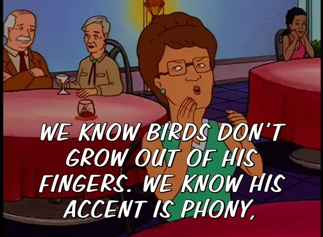 WE KNOW BIRDS DON'T GROW OUT OF HIS FINGERS. WE KNOW HIS ACCENT IS PHONY,