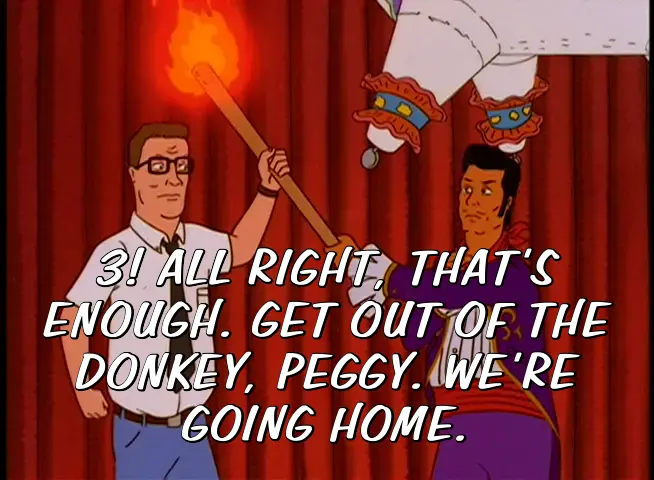 3! ALL RIGHT, THAT'S ENOUGH. GET OUT OF THE DONKEY, PEGGY. WE'RE GOING HOME.
