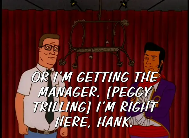 OR I'M GETTING THE MANAGER. [PEGGY TRILLING] I'M RIGHT HERE, HANK.