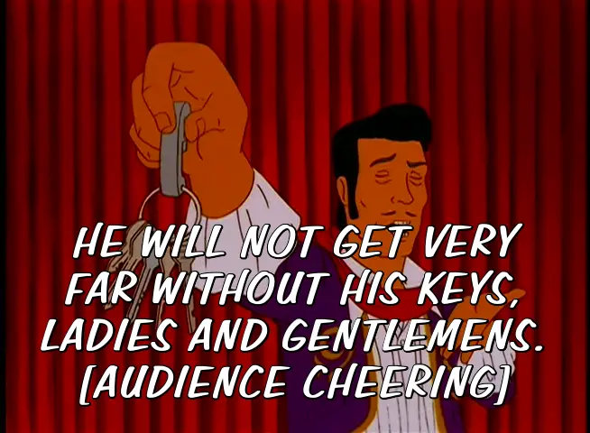 HE WILL NOT GET VERY FAR WITHOUT HIS KEYS, LADIES AND GENTLEMENS. [AUDIENCE CHEERING]