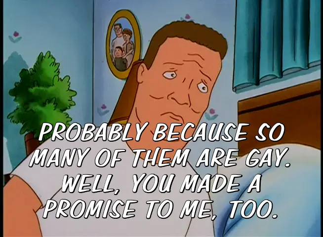PROBABLY BECAUSE SO MANY OF THEM ARE GAY. WELL, YOU MADE A PROMISE TO ME, TOO.