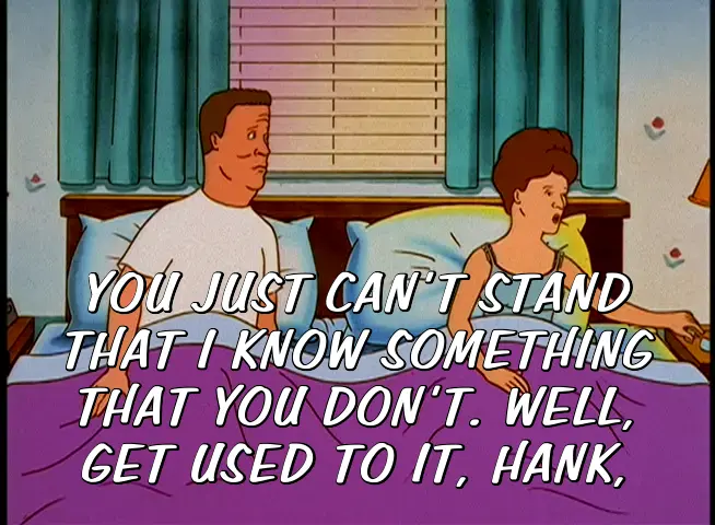YOU JUST CAN'T STAND THAT I KNOW SOMETHING THAT YOU DON'T. WELL, GET USED TO IT, HANK,