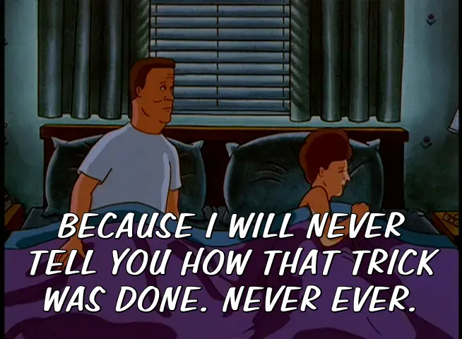 BECAUSE I WILL NEVER TELL YOU HOW THAT TRICK WAS DONE. NEVER EVER.