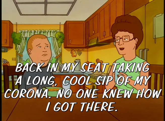 BACK IN MY SEAT TAKING A LONG, COOL SIP OF MY CORONA. NO ONE KNEW HOW I GOT THERE.