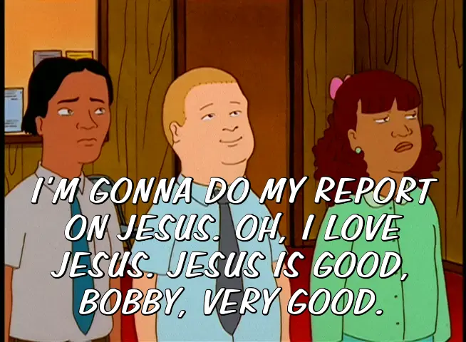 I'M GONNA DO MY REPORT ON JESUS. OH, I LOVE JESUS. JESUS IS GOOD, BOBBY, VERY GOOD.