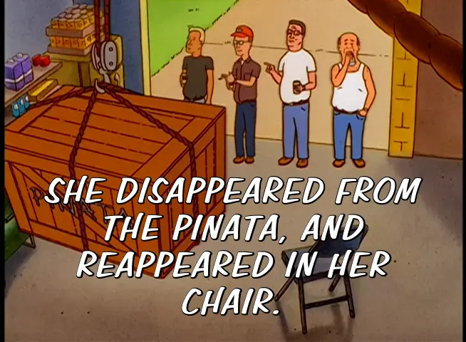 SHE DISAPPEARED FROM THE PINATA, AND REAPPEARED IN HER CHAIR.