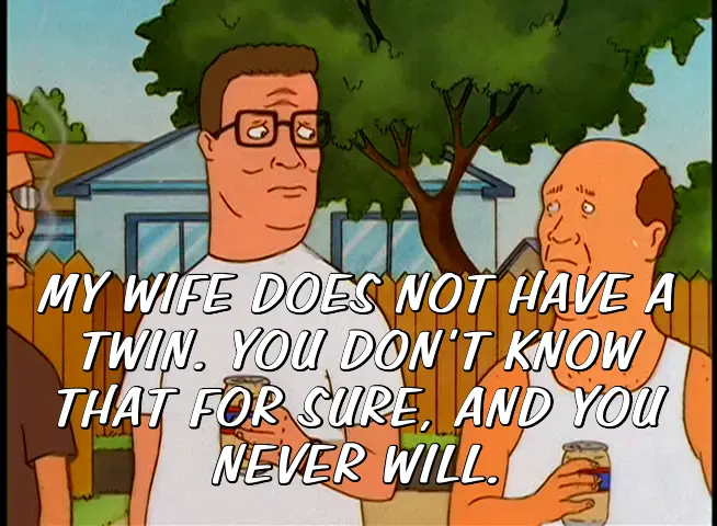 MY WIFE DOES NOT HAVE A TWIN. YOU DON'T KNOW THAT FOR SURE, AND YOU NEVER WILL.