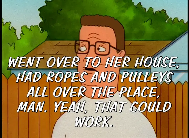 WENT OVER TO HER HOUSE, HAD ROPES AND PULLEYS ALL OVER THE PLACE, MAN. YEAH, THAT COULD WORK.