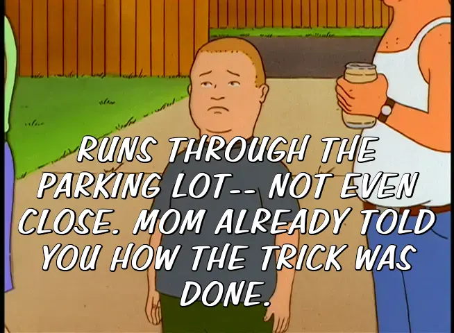 RUNS THROUGH THE PARKING LOT-- NOT EVEN CLOSE. MOM ALREADY TOLD YOU HOW THE TRICK WAS DONE.