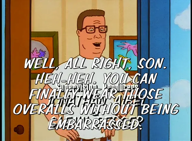 WELL, ALL RIGHT, SON. HEH-HEH. YOU CAN FINALLY WEAR THOSE OVERALLS WITHOUT BEING EMBARRASSED.