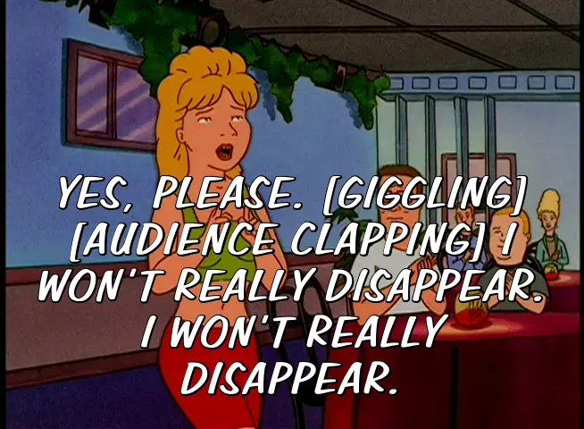 YES, PLEASE. [GIGGLING] [AUDIENCE CLAPPING] I WON'T REALLY DISAPPEAR. I WON'T REALLY DISAPPEAR.