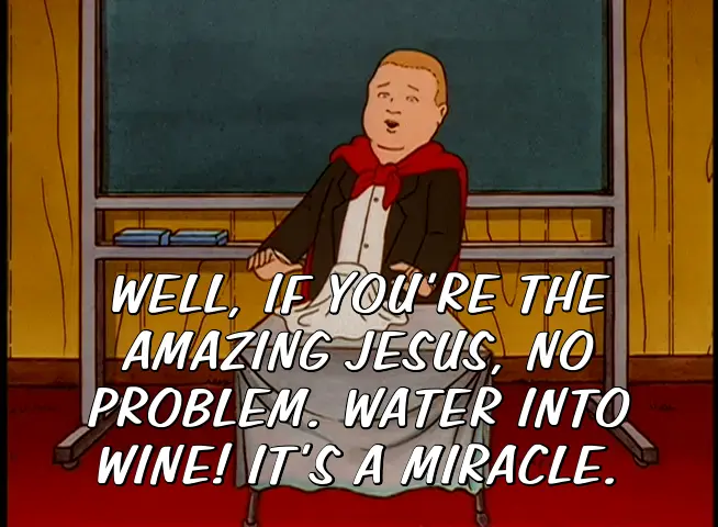 WELL, IF YOU'RE THE AMAZING JESUS, NO PROBLEM. WATER INTO WINE! IT'S A MIRACLE.