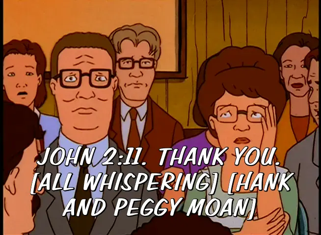 JOHN 2:11. THANK YOU. [ALL WHISPERING] [HANK AND PEGGY MOAN]