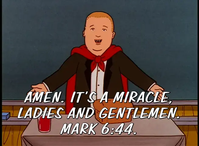 AMEN. IT'S A MIRACLE, LADIES AND GENTLEMEN. MARK 6:44.